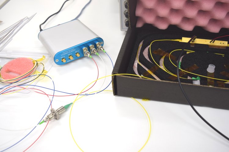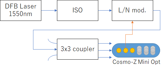 レーザダイオード(1550nm)の出力をL/N光学変調器に入れ、ファンクションジェネレータで生成した正弦波を用いてレーザを強度変調します。