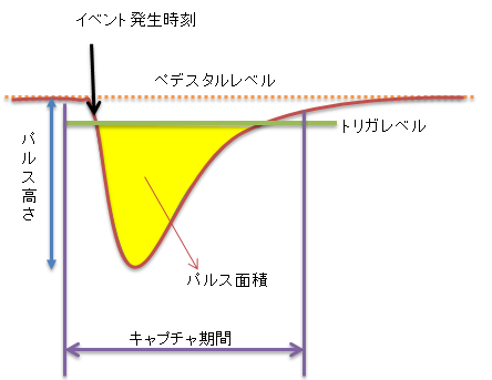 - 計測される値:パルスのピーク値、パルスの面積、トリガ時間、無信号時のレベル他