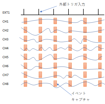イベントモードを使用すると、例えば、周期的に繰り返す外部トリガに同期して、全チャネルのアナログ波形をキャプチャすることが可能です。