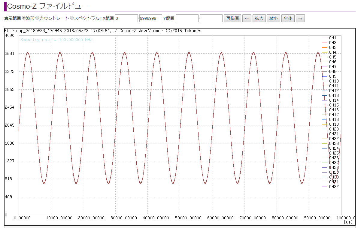 100MHzで、100Hzの正弦波を1000万ポイントの長さ計測