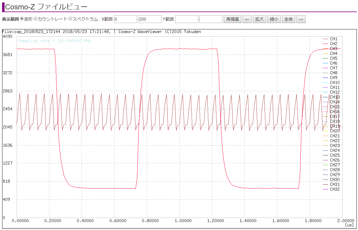 100MHz 2chで、矩形波などを200ポイントの長さ同時計測