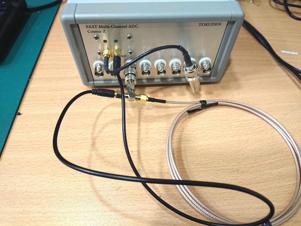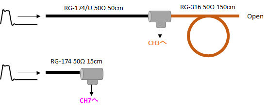 Cosmo-Zから2系統のトリガ信号を出力して、片方を直結してCH7に入力し、もう片方を50cmの同軸ケーブルの後T型分岐でCH3に入力しています。T型分岐した信号は1.5mの同軸ケーブルに接続されていて、終端は解放となっています。