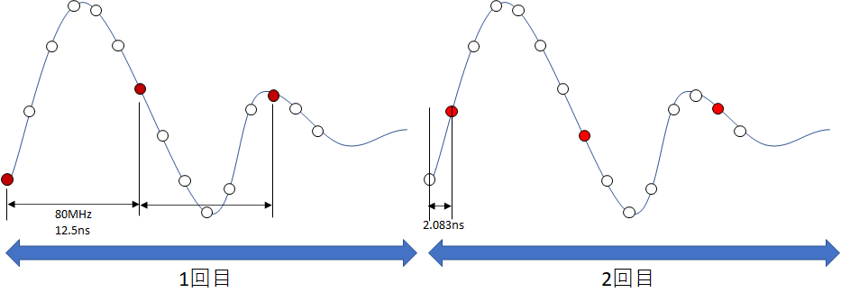 通常、ADCのサンプリング速度は80MHz~125MHzで時間分解能は10ns前後ですが、繰り返し波形に対して、繰り返しサンプリングする際にADコンバータへ送出されるクロックを少しずつシフトさせることで、サンプリングタイミングを少しずつシフトし、本来のADCの性能を飛躍的に上回る、等価的に高い周波数でのサンプリングを実現することができます。