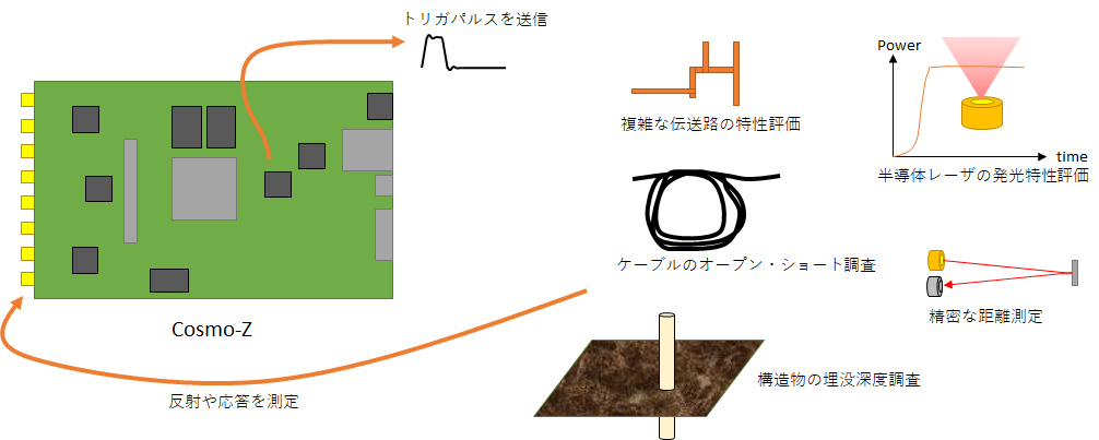 そのため、伝送路の長さやオープン/ショート箇所までの距離の測定、伝送路の形状推定(TDR)、構造物の埋没調査、ほかには半導体レーザの発光特性の評価などに利用可能です。