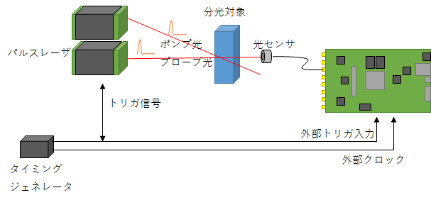 外部同期はポンプ光・プローブ光による吸収スペクトルの変化の観測などに利用可能です。