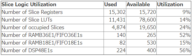 FPGAのリソースは、BRAM36Kを96個、DSP48Eを216個使用します。Cosmo-Zに8chのキャプチャ回路など諸々一式を入れた状態でのリソースの使用率を示します。