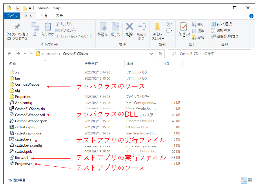 この中で必要なライブラリは、CosmoZWrapper.dllとlibcsz.dllです。libcsz.dllがTCP/IPを通じたリモート接続を行い、CosmoZWrapper.dllがそれをC#の形式でラッパします。
