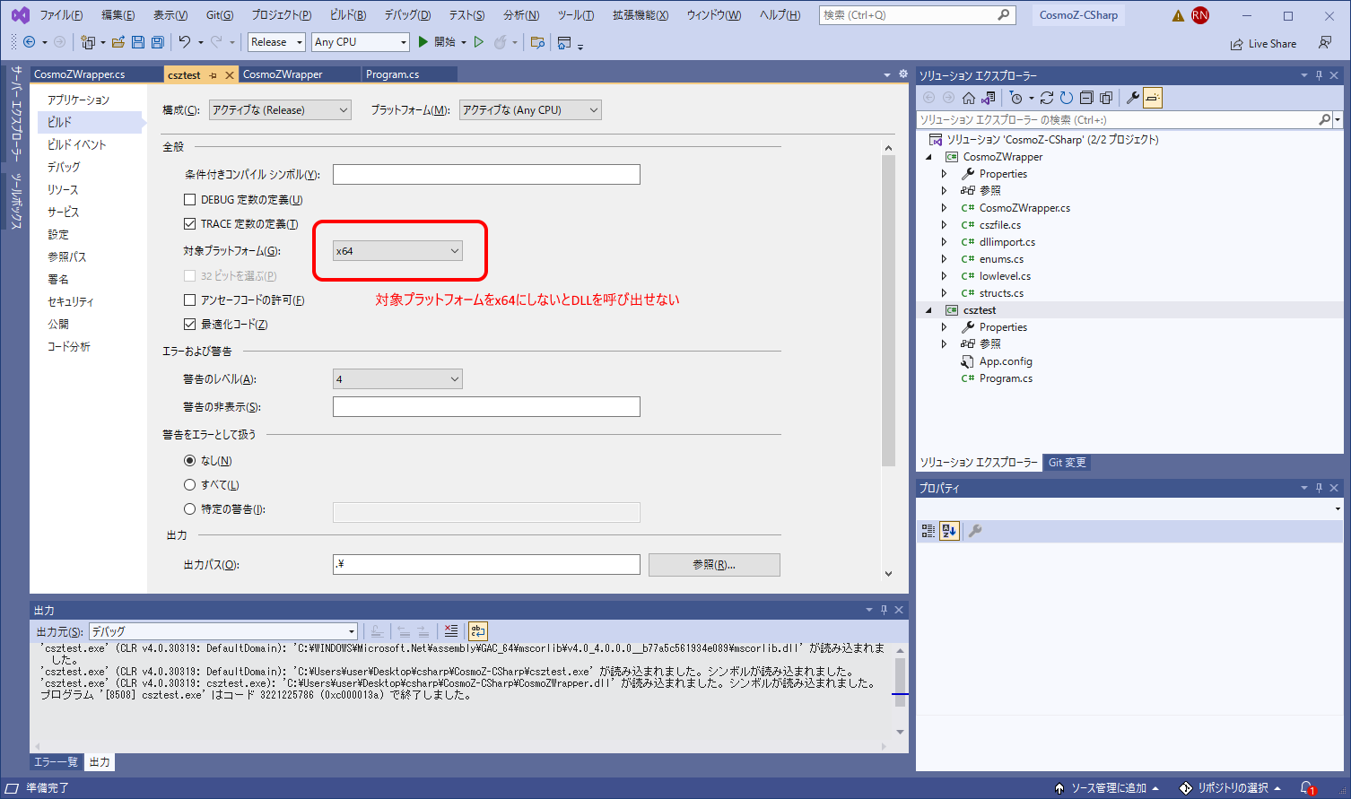 Visual Studioのプロジェクトとしては、対象プラットフォームはx64にしてください。Any CPUだとDLLを呼び出せず実行時にエラーとなります。