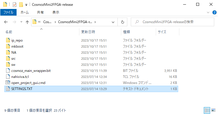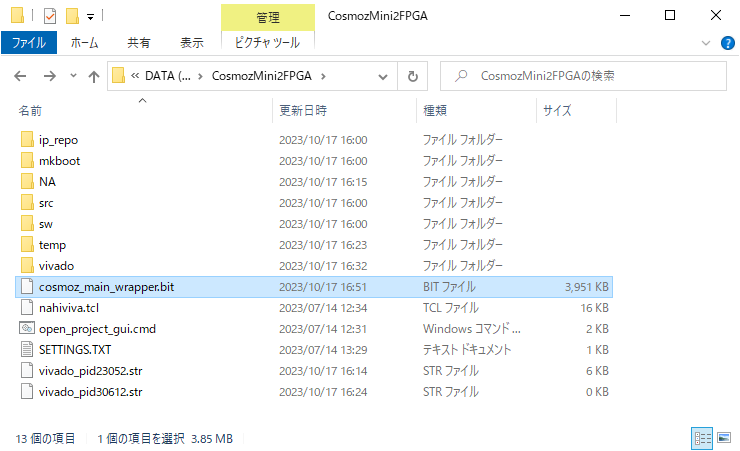 ビルドが完了すると、次の図のように、プロジェクトフォルダにcosmoz_main_wrapper.bitというファイルが出来上がります。