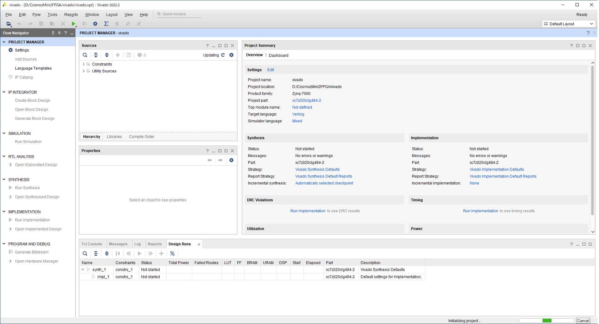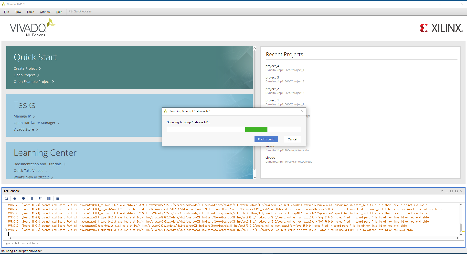 Vivadoがバックグラウンドでプロジェクトを作成するので、そのままにします。