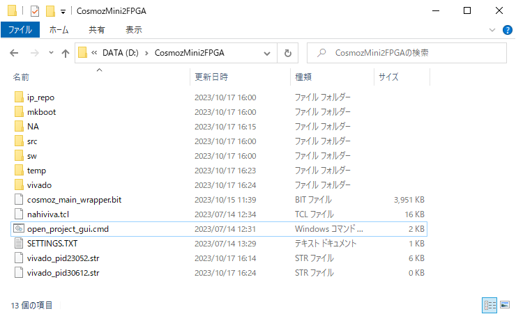 途中でエラーが出たときなど、再度、プロジェクトを生成する場合はプロジェクトフォルダにあるvivadoとtempは削除してopen_project_gui.cmdを実行してください。