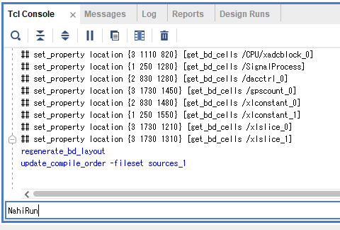 Block Designを変更した場合は、TCLコンソールに NahiSave と入力してください。変更点がTCLのファイルに保存され、vivadoフォルダを全削除しても戻せるようになります。