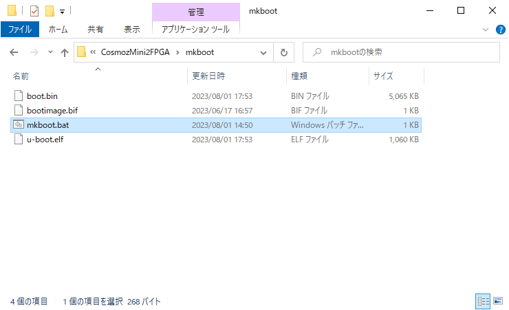 どうしてもローカルPC上でboot.binを生成した場合は、mkbootフォルダに移動して、mkboot.batを起動してください。バッチファイルが起動してboot.binを生成します。
