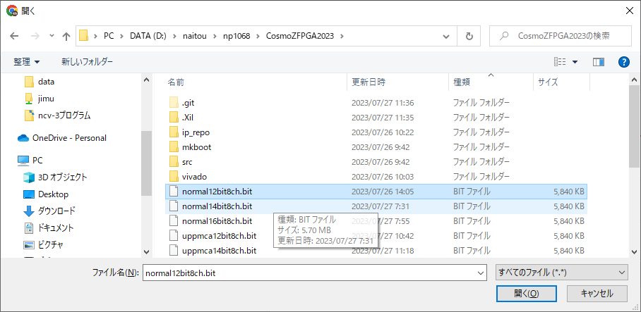 ファイルダイアログが開くので、送信したいbitファイルまたは、binファイルを選択し、「開く」を押します。