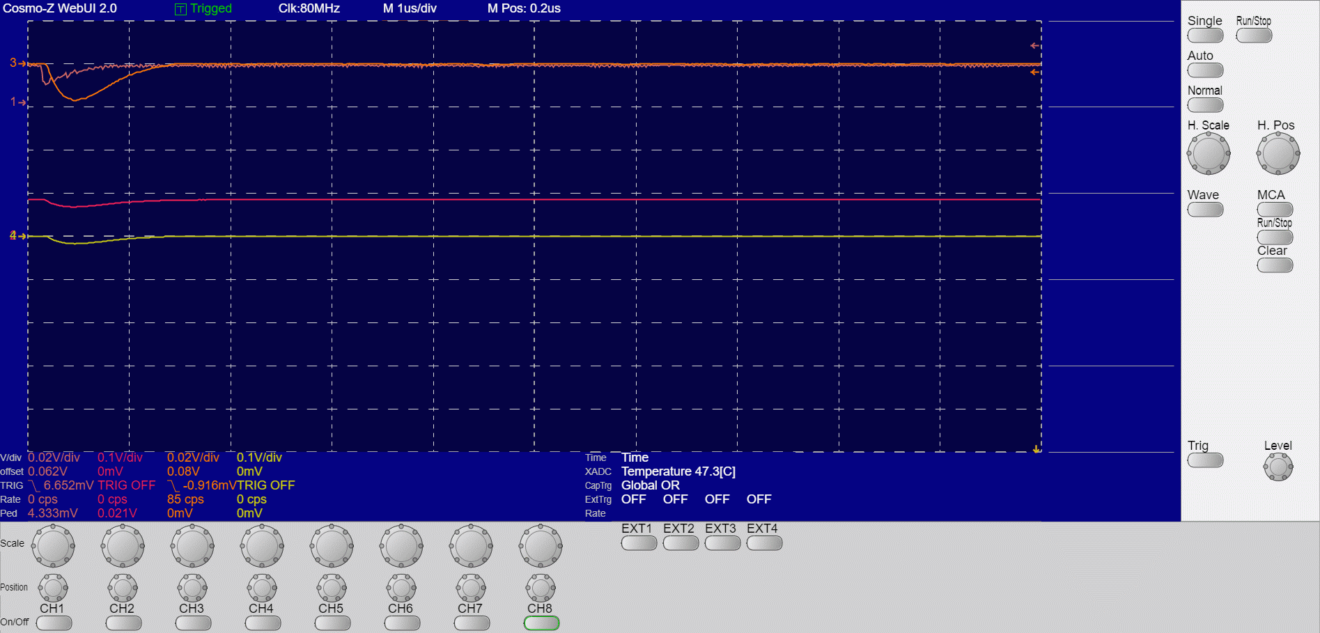 今までのWebインタフェースとは異なり、新しいWebインタフェースは、オシロのような「つまみ」やボタンで操作し、オシロスコープの感覚で操作できるようになっています。また、なんといっても反応の素早さとリアルタイム性は従来の比ではありません。