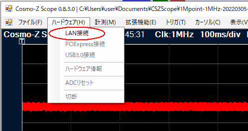 Cosmo-Z Scopeからターゲットボード(Cosmo-ZまたはCosmo-Z Mini)にするには、メインメニューから「ハードウェア」→「LAN接続」を行います。