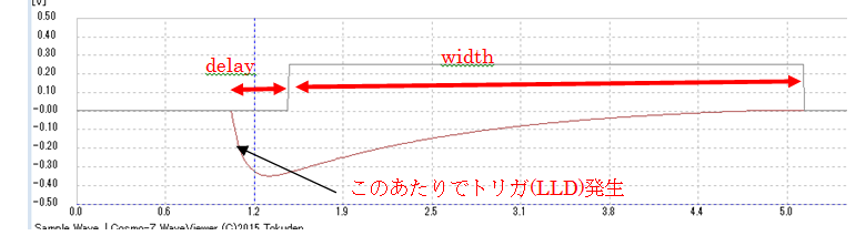 LLDは信号の高さが閾値より大きくなるとトリガを発生しますが、このトリガの時間をdelayで示した量だけ遅延させ、widthの長さだけ引き延ばします。