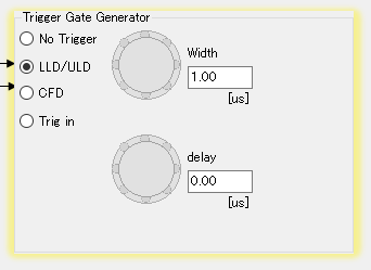ゲートジェネレータの入力はLLD/ULDからのトリガを使うか、CFDからのトリガを使うか、または外部入力を使うかを選択できます。