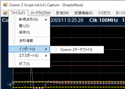 Cosmo-Z Scopeでは、Cosmo-Zのコンソール上で /cosmoz.elf capture コマンドで取得した波形ファイルをインポートすることができます。