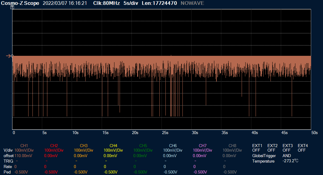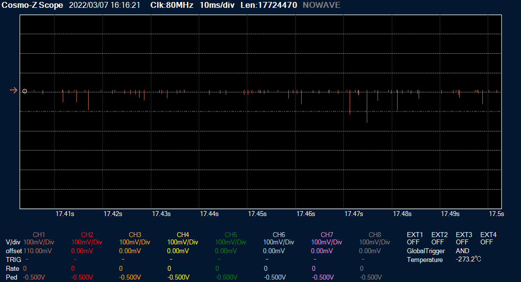 イベントキャプチャでは、イベントが発生している期間のみ信号を記録していますので、下の図のような波形であっても、拡大すると隙間だらけになっています。