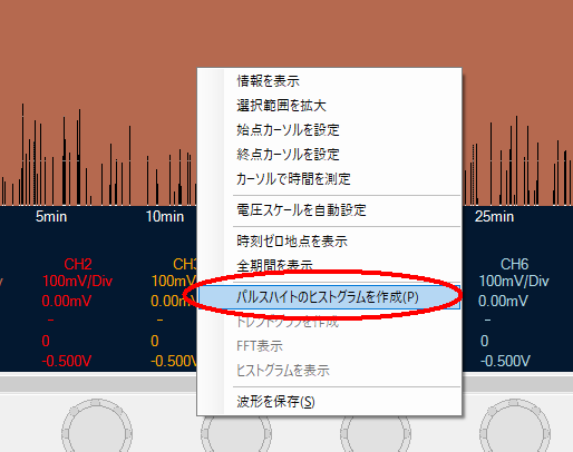 放射線のイベントを計測している場合は、波形ビューの上で右クリックし、「パルスハイトのヒストグラムを作成」を実行すると、