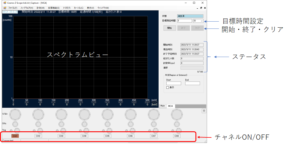 パルスが適切に整形されトリガがかかるようになったら、MCAを開き、目標時間を設定して「開始」ボタンを押します。最初は10秒くらいで計測して様子をみてください。