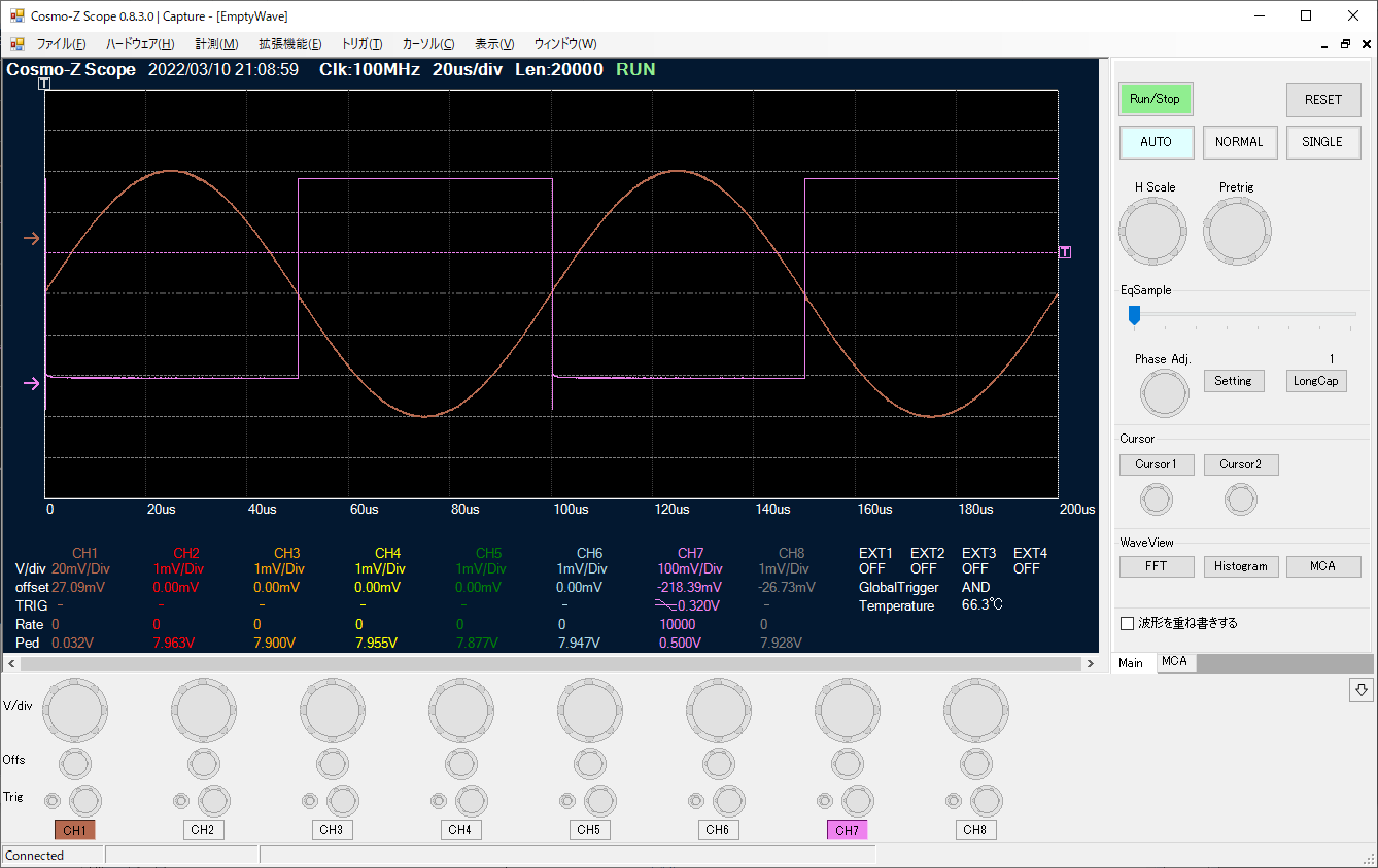 - RUN/Stopボタンは、オシロと同じように波形キャプチャの実行/停止を行います。