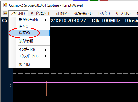 メインメニューの「ファイル」→「保存」を行うと、現在アクティブになっているビューの波形を保存することができます。