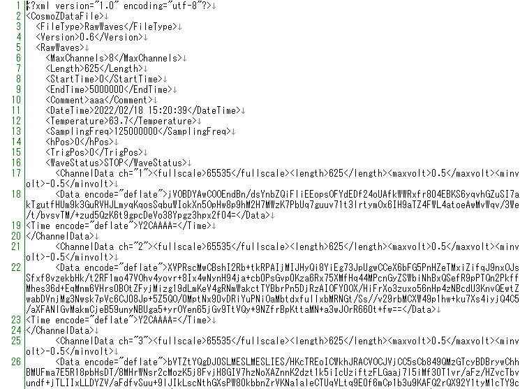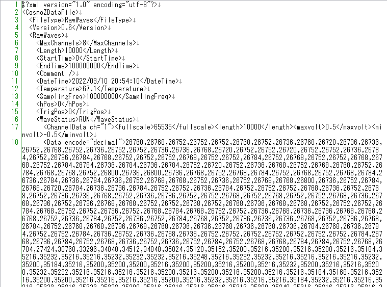 保存される拡張子は、生波形の場合は.csd (Cosmo-Z Scope Data fileの意味)で、MCAのビューの場合は.mcaです。いずれも中身はXMLで書かれていて、可能な限り多くの情報が含まれているため、できれば波形はこの「ファイル」→「保存」メニューで保存するようにしてください。