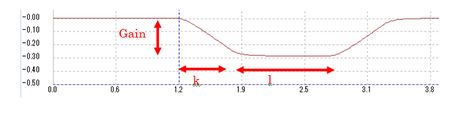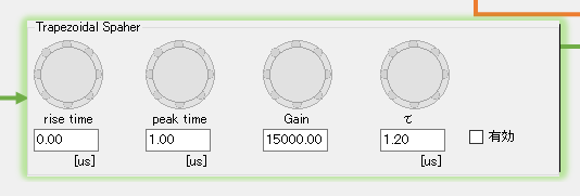 kは整形後の台形波形の立ち上がり時間、lは台形の頂上の時間、Gainは整形回路のゲイン、τは入力波形の減衰の時定数です。デフォルトの値は、テスト波形に対して最適な値となるように設定さています。