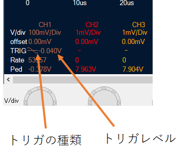 チャネルトリガは、波形ビューの下に電圧レンジやオフセットが表示されている部分の、TRIGの部分で設定します。