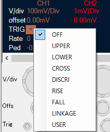 トリガの種類はデフォルトはOFFなので「ー」と表示されています。このアイコンの上でマウスを上にホイールすると、OFF→ UPPER→ LOWER→ CROSS→ DISCRI→ RISE→ FALL→ LINKAGE→ USER→ OFFと変化します。