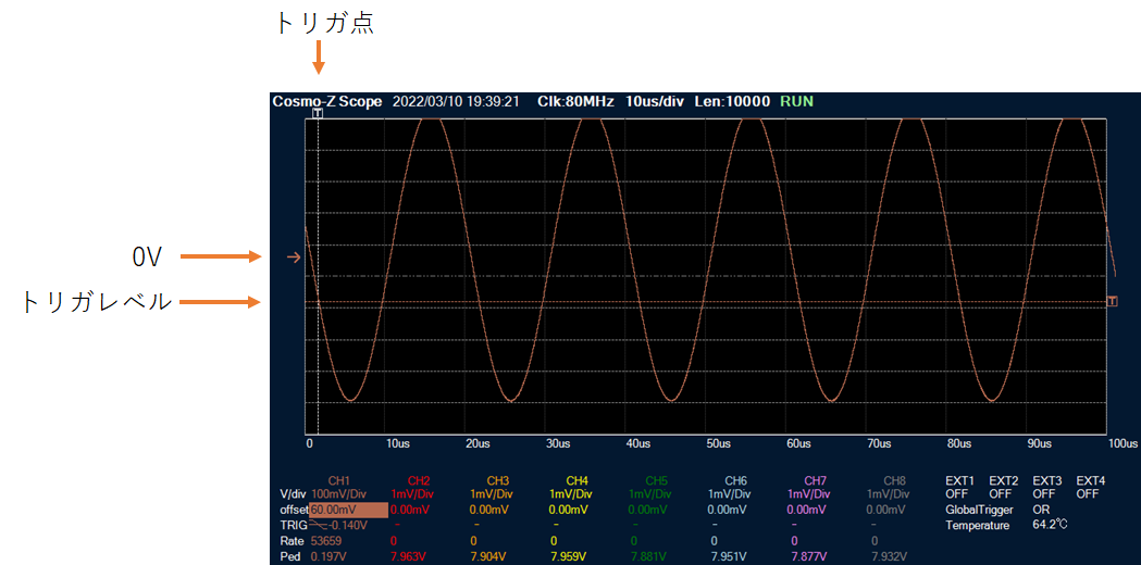 Cosmo-Zのトリガは、アナログ入力のチャネルが発生させるチャネルトリガと、外部からのディジタル入力で駆動する外部トリガ、波形取得の開始信号となるキャプチャトリガ(グローバルトリガ)があります。