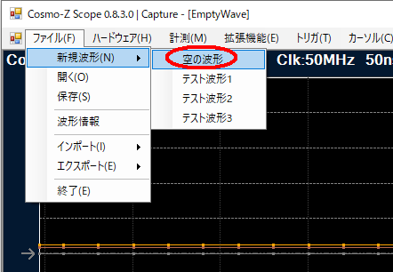 新しい波形ビューを開く場合は、メインメニューから「ファイル」→「新規作成」→「空の波形」を行うか、「ウィンドウ」→「新しい波形ウィンドウ」で操作します。