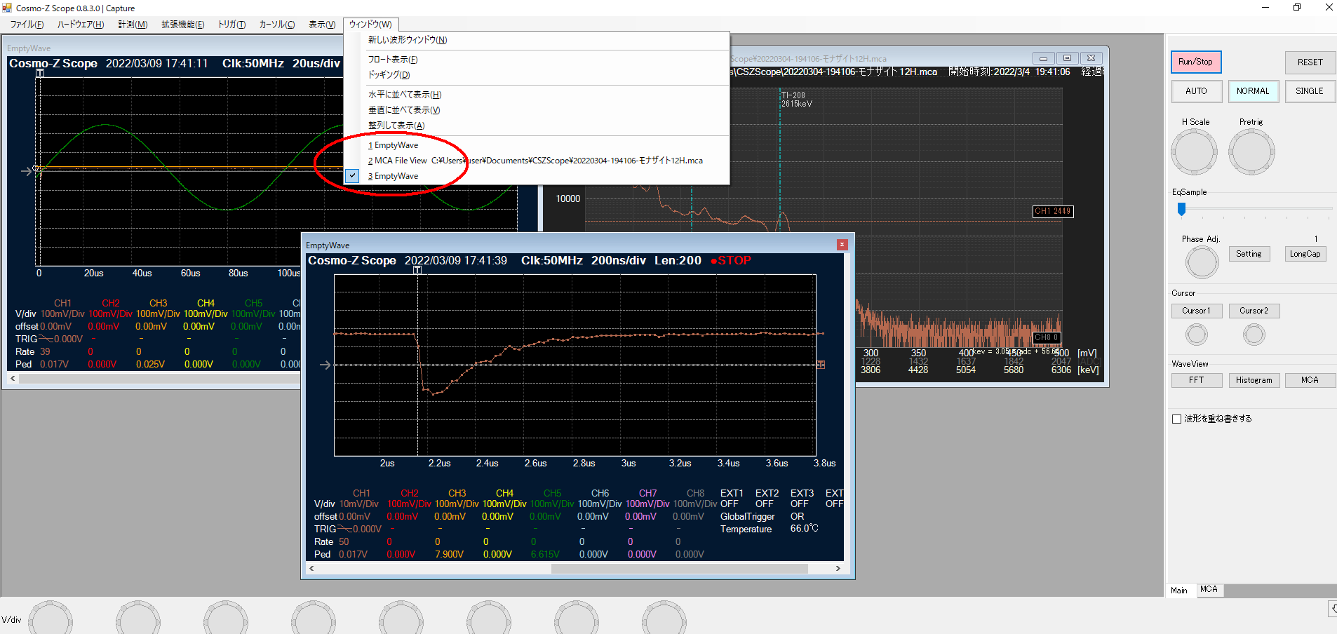 また、複数の波形ビューやスペクトラムビューを開いた場合には、メインメニューの「ウィンドウ」で一覧を見て切り替えることができるほか、Cosmo-Z Scopeの中で同時に開くことができます。