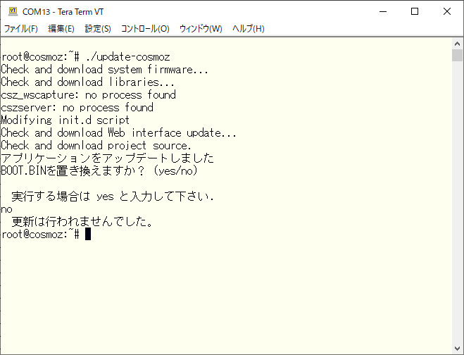 root@cosmoz:~# ./update-cosmoz Check and download system firmware... Check and download libraries... Check and download Web interface update... Check and download project source. Configure FPGA directly with taking hang-up risk? Enter [y|yes|YES] to execute. ← ここではyと押さずにEnterのみ押す コンフィグは行われませんでした。 BOOT.BINを置き換えますか? 実行する場合は yes と入力して下さい. ← ここでyと押してEnterを押す y Check and download firmware 'boot.bin' BOOT.BINを更新しました。 rebootと入力し、再起動してください。 root@cszmini:~#