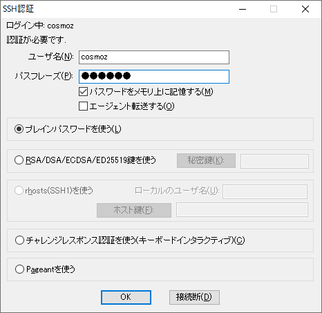 ユーザ名とパスワードは、デフォルトでは「cosmoz/cosmoz」になっています。