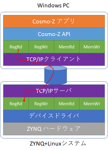 Cosmo-ZのAPIにして備わっている波形メモリのリード/ライト、コントロールレジスタのリード/ライトなどの低レベル操作をTCP/IP越しに行えるようにすることで、Windows PCなどからCosmo-Z APIを介してZYNQのハードウェアにアクセスしています。