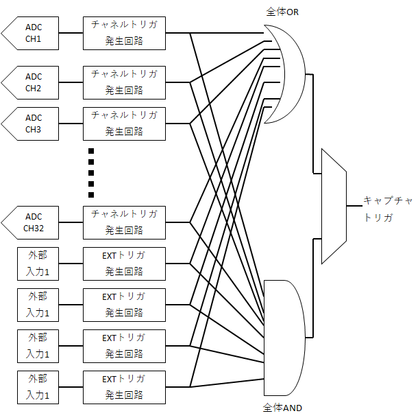 各チャネルでトリガが発生したら、それらのANDまたはORをとり、全体のキャプチャトリガを計算します。全体トリガはオシロモードでの計測の開始(captureコマンド、csz_capture_execute()を含む)に使われます。