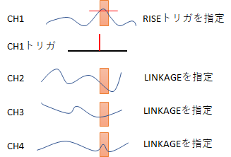 この場合、トリガの判別を行っているのはCH1のみですが、CH2,3,4にLINKAGEが指定されているので、イベント計測モードではCH1,2,3,4が同時に計測されます。
