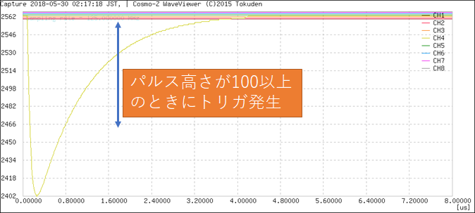 このモードを使うとADC値の値そのものではなく、信号がない期間の値であるペデスタルレベル(ベースライン)からの相対値でトリガをかけることができます。